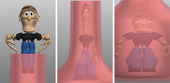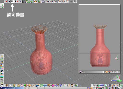17. 設定人物的動畫,先設定畫格為 60 ,在畫格第 60 格時人物移動到瓶底的位置,如圖 17。此人物模型要通過變形塑管,所以其通過的位置必須與變形塑管相同 (0, 0, 0),您必須先行調整好位置。