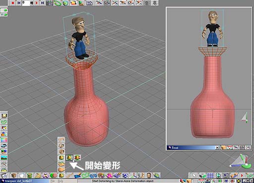 18. 人物模型必須是目前所選取的,選擇開始獨立物件的變形 (Start Deforming by Stand-Alone Deformation object) 工具,此時的滑鼠會變為膠水瓶的樣子,請於變形塑管上點一下,如圖 18。