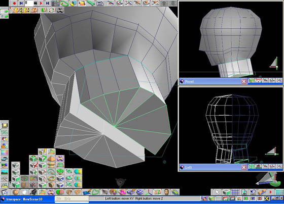 6. 把鼻尖的點往前拉,把鼻翼、嘴角和下巴的點也稍做調整,再把整體臉形做大幅的調整,如圖。 7. 接著在頭部再畫增加一些線,增加面的細緻度,把頭後部稍微往上抬一點。 8. 在下巴的地方畫上一條線,如圖。 把頸部的面選取起來,再按下延展 (Sweep) 按鈕,將面延展出去,如圖。 按下刪除面 (delete Face) 按鈕,再選擇頸部內側的面將它刪除之後再向中間靠近,trueSpace 自動會將中間給黏接起來,如圖。 |