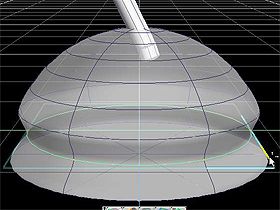 15. 將此 NURBS 球體轉正,如圖 15。我習慣上製作模型時都會對齊網格,通常都會位置以 x=0 及 y=0,故本範例中的模型都會以此為準。 16. 在步驟 14 中增加橫節數是為了製作造型用,視個人喜好設定此參數。在 NURBS 球體上按下滑鼠右鍵可進入編輯模式,先選擇底部上方的整列曲線,如圖 16a。在控制器的角落同時按下滑鼠左右鍵,可等比例的縮小此列曲線,如圖 16b。
