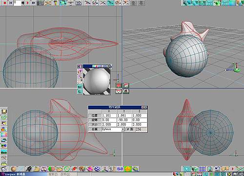 11. 擺設眼睛:將眼睛球體縮小,並擺放其位置;在本例中還將眼睛稍稍的拉成橢圓形,會比較卡通化一點,如圖11。