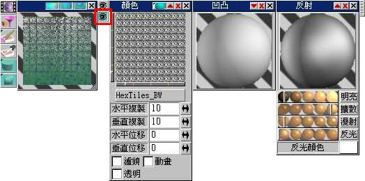 12. 貼圖:材質編輯器選擇顏色: 貼圖,並從trueSpace的貼圖瀏覽器中選擇圖檔HexTiles_BW.tga,並調整水平及垂直複製均為10,彩繪至物件後著色如圖12。