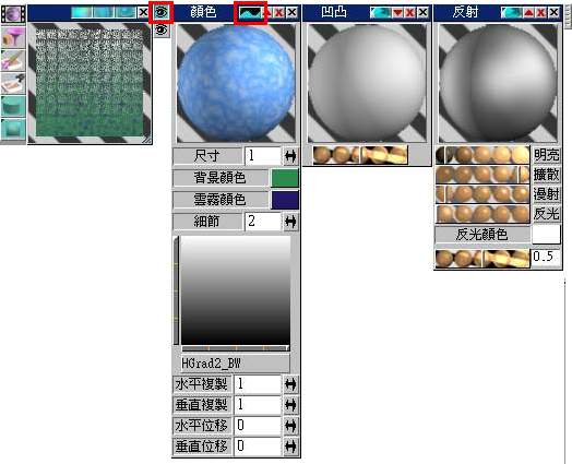 13. 增加材質階層:這樣的貼圖似乎單調了一點,我們必須加一點變化。在辭職編輯器的預覽世昌上按下滑鼠右鍵,並從快顯清單中選擇->新增階層,增加一層材質階層。底層的材質就如同原先的設定,如圖13。