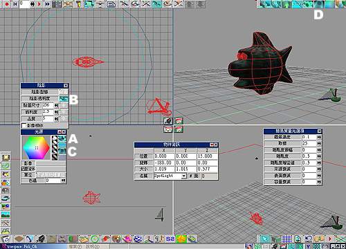 20. 設定光源:在選取聚光燈的時候在其上按下滑鼠右鍵 (或是按下鍵盤的快速鍵L),可開啟光源面板。如圖19A處選擇->啟用陰影效果,並在啟用陰影效果上按下滑鼠右鍵,可開啟陰影面板,在圖19B處設定->穿透陰影,這樣光源的照射才能夠穿透水平面的透明度。並在圖19C處選擇->光源的質量光效果,並在圖19D處的前景質感樣式選擇->基本質量光的效果。