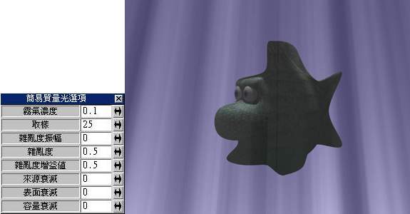 23. 質量光設定:光源衰減後質量光的效果也會有所改變,可以增加質量光的濃度,參數調整及著色後如圖23。若是覺得光線過暗的話,可以適度的補光。