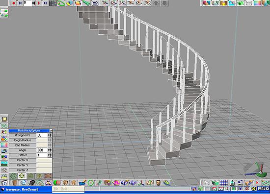 陣列教學--旋轉梯有時在一些場景當中,我們會需要做到重複性高的模型,例如軍隊,鐵軌,旋轉梯等等,平常最一般的做法,就是不斷的複製再做排列,但是這樣做的話,往往會因為一些誤差,而使模型變得不整齊或是距離不同,在trueSpace6當中,Array Tools(陣列工具)則可以為您省下不少時間。 15. 請先建立一個長方體,並將其中一邊縮小,加上兩個圓柱,並且用等位聯結將所有物件連接起來,如圖15。