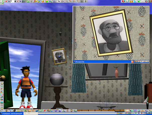 27. 我們也可以自己製作影像彩繪影像至物件上,如同畫面中的相框內的照片,本處我們使用黑白照片的效果,本處可以讓您了解 3D 變成 2D 是很麻吉的。