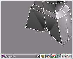 再來我們要處理臀部部位了,其做法和胸部類似,但很可惜的,天不從人願,這兒的 面積並不方正,所以我們就只好靠自己來修改和創造我們要的面積了,首先選取這 兩條礙眼的線段,如下圖 44,然後執行消除頂點功能,如下圖 45,這兩條線從此不 見了.