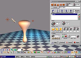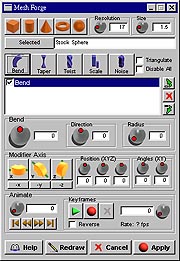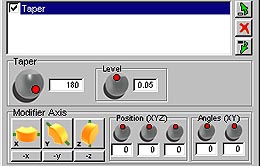 當完成動畫的錄製時,最後必須要套用(Apply)到模型上。 變粗細(Taper) Taper可以讓物件的收縮,同時您還可以調整收縮位置,感覺上有點像是trueSpace中的截面變形,但是透過旋鈕的控制方式,變形的效果會更佳,如下圖: Taper:變粗細的角度,用滑鼠控制旋鈕,可以讓球體彎粗或細,負值為變粗,正值變細。 Level:變化的位置。 Modifier Axis:控制從那個座標軸進行彎化,預設值為Z軸。 Position(XYZ):控制彎化的一端的位置。 Angle(XY):控制物件整體的角度。 我們以球體進行示範,如下二圖,二者的Taper數值相同,但是Level值不同的結果。