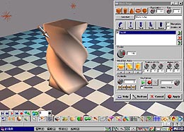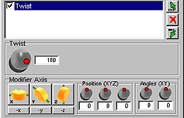 扭曲(Twist) Twist可以讓模型像螺旋一樣自由的扭曲。 Twist:扭曲的角度,正值為順時針,負值為逆時針。 Modifier Axis:控制從延著那個座標軸進行彎化,預設值為Z軸。 Position(XYZ):控制彎化的一端的位置。 Angle(XY):控制物件整體的角度。 以下以正方體進行扭曲180度的示範: 畫面中我將文字延著水平的方向旋轉了360度,如下圖,看倌,您覺得這個效果是否不錯呢? |