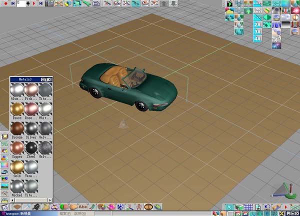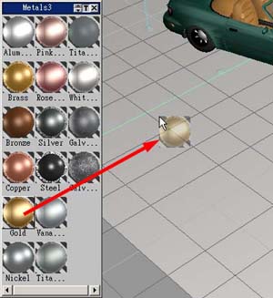 新手上路 頁數:4/5 效果營造 我們按下「材質資料庫」圖示,並選擇一組資料庫"Metals3",其中有一個"Gold"材質,我們直接用滑鼠拖曳此材質,並放到地板上,即可完成改變地板材質的動作。