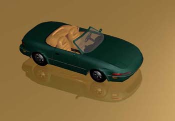 好了,我們完成了倒影,接著,再按下「光源資料庫」圖示,會開啟「光源資料庫」面板,這是trueSpace 已經做好一些打光範本,您不需要自已加入光源,只要按一下任何圖示,trueSpace 就會幫您擺好並設定好光源。我們選擇其中的一組"MultiSpot1"光源,接著場景中光源便會重置為MultiSpot1光源所設定的狀態,這是六個聚光燈所構成的光源設定,如圖。