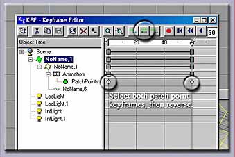 圖 5 : 我門市要做出花綻放的效果,可是現在的花瓣是由平躺變成彎曲的狀態,其應該為彎曲變為平躺的狀態。要進行此調整,先開啟關鍵畫面編輯器 (KFE、Key Frame Editor),展開動畫物件直到看到 PatchPoint 的關鍵畫面。使用滑鼠拖曳的方式,將二個關鍵畫面選取起來,選擇關鍵畫面編輯器上方的 "反轉" 工具,這樣會將關鍵畫面倒轉,如此我們的話半就是由閉合到開放了。