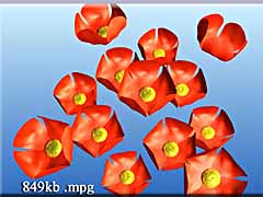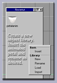 圖 6 : 現在我們要將物件置入資料庫中,點選物件資料庫的圖示 (圖示上有輛汽車的),開啟物件資料庫;然後在物件資料庫的空白處按下滑鼠右鍵 - 出現快顯清單,選擇 "新增" - 建立一個新的物件資料庫。在有動畫的花瓣模型選取的模式下,在空白的物件資料庫按下右鍵,從快顯清單中選擇 "置入 (Insert)",此物件將被紀錄在資料庫中,包含其所有的屬性及動畫。您也可以貼上材質後再置入到物件資料庫中。