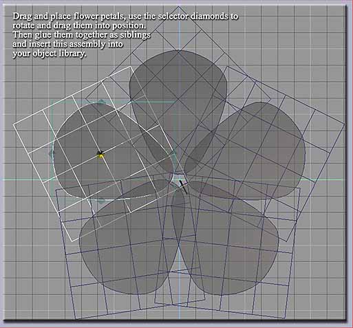 圖 7 : 若是您已經將物件置入資料庫中的話,你可以從資料庫中拖曳並利用物件指示器擺設其位置,如上圖所示。我的顯示畫面為 "將物件繪製成透明並顯示外框 (Draw object as transparent outline)"。連結這些花瓣並將其置入物件資料庫中,或是您可以將花瓣的尺寸稍微的縮小。