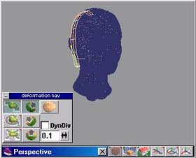 提醒您一下,當您啟動變形工具時,其綠色的變形控制線較少。您可以在開始進行變形前,適度的增加變形控制線 (在場景空白的區域中,同時按下滑鼠左右鍵拖曳,可增加控制線)。 若是您已經進行了變形,無法增加控制線的話,您可以選取點編輯工具,其會出現一對話框,說明物件已有變形,詢問您是否要刪除此變形,您可以選擇“是”。當然啦! 最好的辦法還是在進行操作前,先將髮束複製或存檔,這樣可一勞永逸。