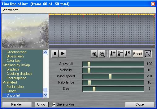 除了繪圖工具外還有動畫的製作工具,利用一般動畫濾鏡的觀念,可為影片增加動畫的效果。在本範例中,快速的幾個簡單動作來製作動畫,產生下雪的畫面。從本範例的介紹與說明,您可以瞭解在