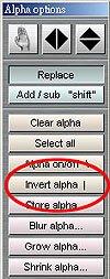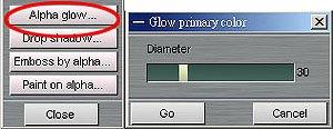 12. 設定發亮效果,在製作前要先反轉 Alpha 選取區,現在請按下「Invert Alpha」按鈕,然後設定要發亮的顏色 (例如:主色為藍色),按下「Alpha glow」(發亮) 按鈕,將拉桿調到30~35間,如圖 12a。在「Alpha Panel」面板,按下「Clear Alpha」按鈕,結束 alpha 編輯,完成如圖 12b。