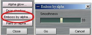 10. 接下來加入一些特效,在「Alpha Panel」面板中,按下「Emboss by alpha」(浮雕)按鈕,如圖 10a,將拉桿調到30~35之間,效果如圖 10b。