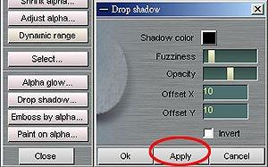 11. 設定陰影效果,按下「Drop shadow」(陰影) 按鈕,在 Drop shadow 視窗調整位置、顏色等設定,可以先按下「Apply」(套用) 按鈕,如圖 11a,看看陰影的效果對不對,確定請按「OK」,如圖 11b。