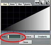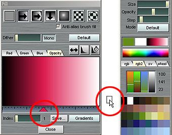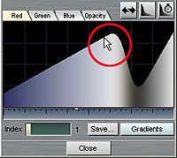 另一種自訂漸層的方式,直接在編輯視窗以滑鼠掃過的方式來設定漸層,可分別在R/G/B與Opacity標籤的內容做編輯。 |