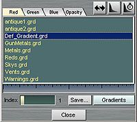 另外,按下面板下面的「Gradients」按鈕,它會列出目前可用的漸層檔,每個漸層檔也都有八組不同的漸層色彩,都可以利用拉桿找到每個漸層色彩。 |