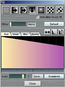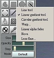 線漸層所畫出的漸層會舖滿整個畫布,在畫布中拉出一條線,它會依據拉出的方向做出漸層,拉出的線條長短會影響漸層的分佈狀況,線條畫出的範圍即是漸層色彩(請看漸層面板的顏色),線條以外的範圍是以漸層色彩最右邊的顏色來舖滿,請看下圖。 |