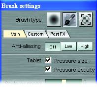7. 將「Brush settings」的「Table / Pressure size」與「Pressure opacity」前的選項設定打勾,啟動壓力與飽和度的感應效果,如圖