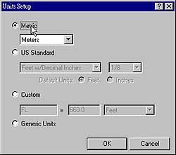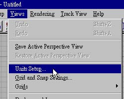 | page 5-2 適用版本:Life Forms 3.5 + 3D Studio MAX R2 以上 發表日期:1999.9.6 二、 3D Studio MAX的準備工作1. 首先,在 MAX 中建立 Model 之前,可以先按下 Views->Units Setup 來 設定單位,如圖 1,接著會出現 Units Setup 對話方塊,點選 Metric,並在 下拉式方塊選擇 Meter,如圖 2,按下 OK 結束設定。