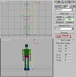 2. 當建立好 Model 之後,請按下 Create->Helper->Tape 拖出與 Model 同 高的線,此時,可以在 Length 中看見 Model 的高度,如圖 3,然後請點選 Specify Length,修改 Length 的數字為 1.8,並選取 Model 的所有物件, 將它們縮放至與黃線同長的高度,如此,叫進 Life Forms 才不會出現過大或 過小的 Model。