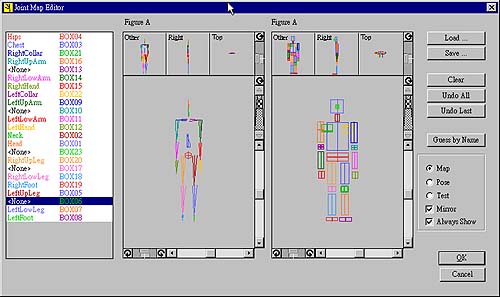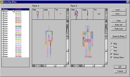 4. 在 Browser 視窗中選擇好所須要的動作,再按下 Paste,如圖 16 框取的 部份,會跳出一個 Joint MAP Editor 視窗。 5. 在左邊物件的 List 中,必須由第一個物件 (即臀部) 開始對應起,當我們 用滑鼠點選到之後,右邊的 Destination 會以粗線表示目前所選到的物件, 如圖 17,此時你只需在左邊的 Source 中點選同樣的部位,中間物件 List 視窗中,便會變成對應部位的名稱。