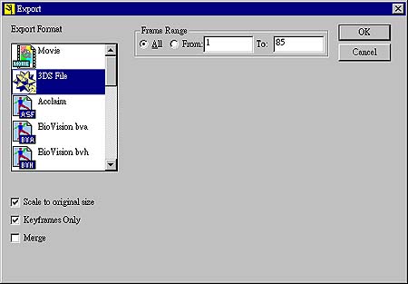 8. 選擇 File->Export 出現 Export 對話方塊,點選 3DS Files,在 Frame Range 核取 All,並把下方的 Scale to original size 與 Keyframes Only 點選起來, 如圖 20,按下 OK,存好檔案即可。