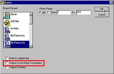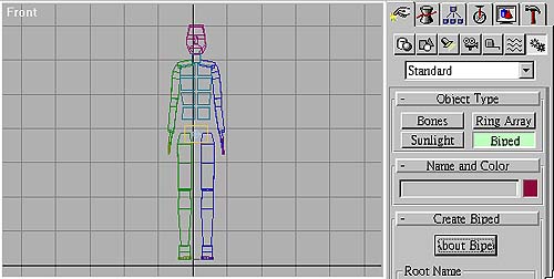 2. 接下來套上你需要的動作。 3. 選擇 File>Export,選擇 BioVision bvh 做為輸出格式,請注意 Output In Left-Hand Corrdinates 不要核選,如圖 2,不然載入 Max 中方向會出現錯誤。 4. 開啟 3D Max 並按下 Creat>systems>Biped 在 Front 拉出一個人物,如圖 3。