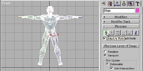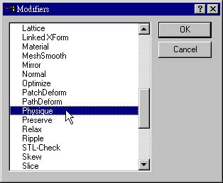 | page 4-4 適用版本:Life Forms 3.5 + 3D Studio MAX R3 發表日期:1999.10.10 10. 按下 Display>Freeze>Unfreeze All 將 Modle 解凍,再選擇 Modify>More> Physique 如圖 11,出現功能表之後再按下 Modify>Physique>Attach to Node 設定重心,如圖 12, 請選擇 Bip01 物件,此物件是 Bip 人物的重心。如果出現如圖 13 的樣子表示配合成功。