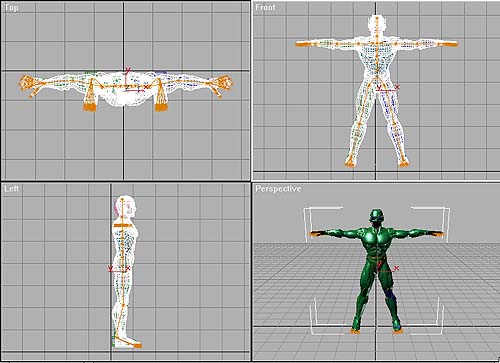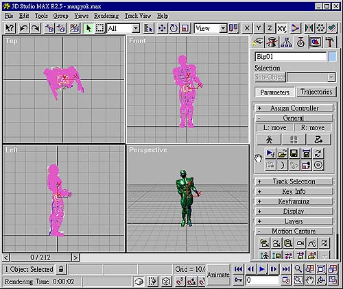 說穿了在本例之中主要是將 Life Forms 中現有動態資料轉換為 BioVision (*.bvh) 的檔案格式,然後在 MAX 中利用 Character Studio 將動作資料轉為 Bip 的格式,然後將動態資料套用到您的模型上。步驟上雖然有點多,但是呢? 他可以讓我們在 MAX 中快速的產生人體動作,方便了許多許多。 參考檔案