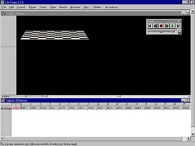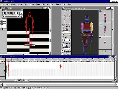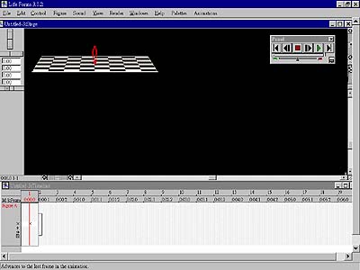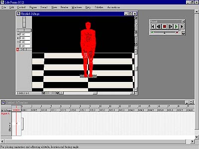 Life Form 在操作上非常的簡單,不過你得先搞清楚一些面板,否則一開始可能會一 團亂.在我們進入 Life Form 之後,通常 Life Form 會秀出三個面板,分別為左上的 Stage 面板,下方的 TimeLine 面板,以及又上方的播放面板(見附圖1). Stage 面板 是 Life Form 的表演舞台,你可以在此指定人物做一些動作,而所有動作的時程則可 以從 TimeLine 面板中得知.至於播放面板,則是在當你完成人物動作編輯後觀看結果 的面板.筆者先來為各位示範一遍 Life Form 的簡單操作方法: 1) 從 Figure->New Human 選單中選擇任一個人形, Life Form 提供三種人形 - Male. Mail Classic, Female.選定之後你會看到 Stage 面板裡已經多了一個人物 造型了(見附圖2).