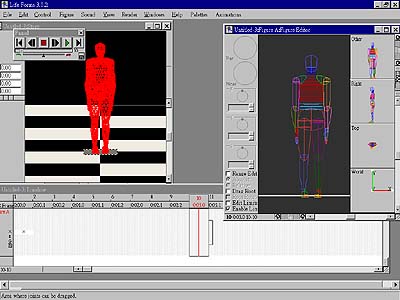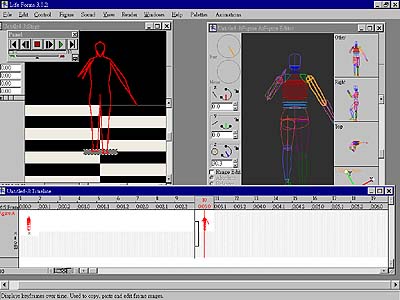 3) 在人物出現了之後,接下來我們就要來帶動作了.首先我們用滑鼠在 TimeLine 的第十個 Frame 上按兩下,你會發現除了 TimeLine 移動到第十個 Frame 之外, 又出現了一個名叫 Figure Editor 的面板(見附圖4).這個面板就是讓我們編輯 人物動作的地方.跟一般的動畫軟體一般,它提供了四個視點可隨時切換以方便 我們編修人物的動作.你只要選定某個關節,就可以開始調整物件的動作了.