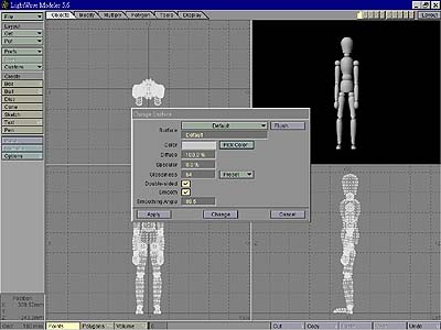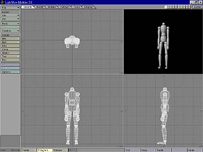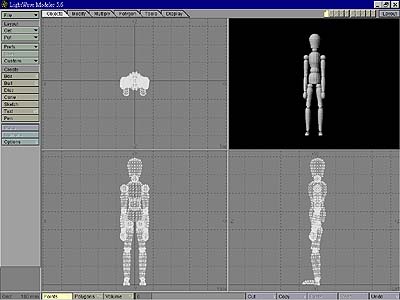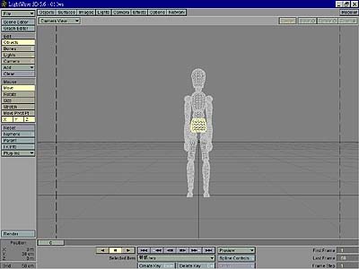 | page 8-3 適用版本:Life Forms 3.0.2 + LightWave 5.5 以上 發表日期:1999.9.8 筆者使用的是 Lightwave 3D .在 Life Form 裡對於 Lightwave 3D 的支援最為齊備, 因為在支援 Lightwave 方面, Life Form 對於 Lightwave 的連結物件, Bone 物件, 甚至連 Lightwave 的外掛程式 - Puppet Master 都可以支援.這表示 Lightwave 的使用者可以完全體會 Life Form 的威力呢!這在對大多數軟體都只能支援連結物件 的情況下, Lightwave 的使用者真是蠻幸運的! 一般說來,我們在做人物模型時有兩種做法,即所謂一體成型的物件以及連結物件, 在早期因為動畫軟體功能不足或是為了方便人物帶動作的情狀之下,我們通常都將 人物分成許多部份,使用連結方式將整個人形串起來,其好處是帶動作容易,只要設 定好主從關係 (Parenting) ,只需選定你要動作的物件,就可以調整人物的動作了. 而缺點是你可以看到非常明顯的接縫,這個接縫常讓人感到人物有十足的缺陷,而 這樣的做法目前仍然流行於各種 3D 遊戲裡.是最普遍可以看得到的人物製作方式; 至於一體成型的物件,則是目前動畫人員所最想趨之若騖的一個境界,因為它有一定 的難度,得相當考驗你對於人體的一些觀念.作出來的模型漂亮,無接縫,目前你所看 到的遊戲片頭人物,多是這類型的模型來完成的.而缺點則是因為它是一體成型物件, 必須要靠 Bone 的設定讓物件產生適度的變形,而 Bone 依其設定的影響範圍之不同, 對於物件的影響部份也不同,因此事實上是一個很據挑戰性的工作. Lightwave 本身既支援連結物件,也有著 Bone 的設定系統,更甚者,如果你對於 Lightwave 的 Bone 系統興趣缺缺的話,你也可以選擇 Puppet Master 這一套 Lightwave 的外掛程式,讓你不需要靠 Bone 就可以調整一體成型的物件.以下筆者 就分別根據連結物件, Bone 物件,以及 Puppet Master 這三個部份為各位說明 Life Form 對於 Lightwave 的支援特性. 連結物件部份:本例中筆者以木頭娃娃的造型製作連結物件,這個物件是從 Poser 裡頭輸出的. Poser 的物件可以輸出成 DXF,OBJ... 等檔案,筆者將它輸出為 OBJ 檔案.從 Lightwave 中 將 OBJ 檔案載入,我們可以看到木頭娃娃的造型 (見附圖14).請注意木頭娃娃的雙手是 下垂的, Life Form 規定連結物件的手臂一定要是下垂的,因為 Life Form 內定的人物 手臂就是下垂的,如果你將手臂攤平的話,將會造成旋轉角度的誤差,這一點請千萬注意.