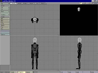 回到原本的 Layer ,頭部物件不見了,更方便我們接下來物件的選取 (見附圖19), 我們利用前面所說的方法,將各部份的零件一一取出,也一一的將零件存檔.在選取 物件並貼入其它 Layer 時請注意. Lightwave 的物件在存檔時會記住物件的所在 位置,因此你並不需要去特別的移動零件的位置,因為在本例中,所有零件都已經在 其正確的位置上了.