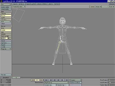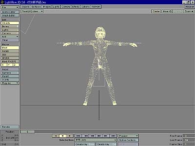 你可能沒辦法馬上調到很適當,不過沒有關係,只要你再回到 Modeler 裡調整尺寸以及 位置,多試幾次一定能夠調整到比較適當的狀態.當然由於每個人體物件的各部位比例 不同, Bone 不太可能大小都能跟物件一樣,因此我們只需要調整到大概的大小,接下來 就是調整 Bone 的尺寸而已了. 調整 Bone 的角度以符合人體的造型 (見附圖47).設定完畢之後在 Frame0 產生 Keyframe 以定位所有 Bone 的新位置.接著進入 Objects 面板,按下 Object Skeleton 按鈕進入 Bone 的編輯面板,將所有 Bone 的 Bone Active 選項開啟 (以筆者的經驗, 建議你從最上層的 Bone 先啟動,這樣比較不會產生不可預期的錯誤).或者你也可以 直接在 Layout 裡指定 Bone 之後按 "R" 鍵,一樣可以啟動 Bone (啟動 Bone的時候請 不要到別的 Frame 去啟動,如此會產生錯誤的拉扯,切記). Bone 啟動之後,你從 Frame 0 可以看到正常的情形 (見附圖48).
