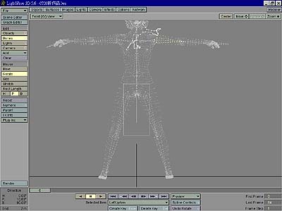 如果你覺得 Bone 的尺寸太大的話 (事實上 Life Form 輸出的 Bone 數量在 Lightwave 裡是不太夠的),你可以將 Bone 給分成幾個部份.比如如果你覺得身體中間 支柱的部份只有一根 Bone 太少的話,你就可以將那根 Bone 斷成兩條,讓原本一根 Bone 的中間支柱變成兩根,這樣對於因為 Bone 的影響範圍過大而導致模型被拉扯的 情形也可以有所改善.在附圖50 裡你可以看到調整完之後的人形,模型被拉扯的情形 已獲得改善了 (見附圖50).關於 Bone 的增減方法以及 Limit Range 的調整方法, 請參考 Lightwave 使用手冊.在此筆者不多做說明.