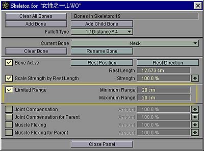 移到下一個畫面,你會看到人物雖然作出了動作,不過身體被拉扯得很嚴重.那是因為 Life Form 的 Bone 並沒有考慮到 Lightwave 的 Bone 特性的關係,會造成這個原因 通常是因為 Bone 得大小不相稱或是影響範圍不適當所造成的.你可以先去 Bone 的 編輯面板調整每根 Bone 的 Limit Range ,看看情況是否有改善 (見附圖49).如果你 的 Limit Range 調整個半天都不見改善的話,你就可以針對 Bone 的尺寸做一番調整了.