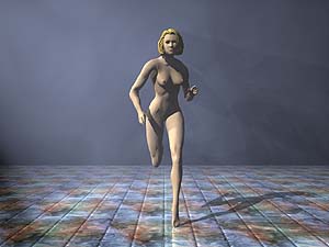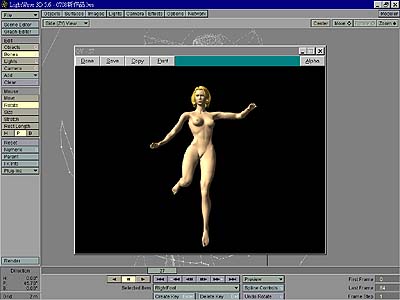 用 Life Form 來輸出 Bone 的動態有什麼好處?當然除了動作真實之外,還有一個筆者 認為最值得的就是可以避掉 Gimbo Flow 的問題,所謂 Gimbo Flow, 只的就是 Bone 在某個角度下會變成只有兩個旋轉角度而已.如此一來,你會有一個軸向怎麼轉都沒有 辦法轉出來,雖然發生的原因是因為 Bone 的設定問題,也不見得每個人都會碰到,不過 碰到了,總是很麻煩 (我想碰過這個問題的人現在一定心有戚戚焉吧?),而在 Lightwave 要解決這個問題,也是得用些技巧才行.但是如果你用 Life Form 的話,因為 它已經幫你都定好位置了.因為就不會有角度轉不出來的問題了.這對於 Lightwave 的使用者要不要使用 Life Form 這一點,實在是很具說服力的. 調整完畢,你的人形就可以產生超級真實的動態了 (見附圖51).打打燈光,設定材質, 動畫就這麼完成了. |