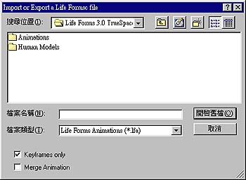 匯入 Life Forms 檔案 (一)在 trueSpace 中使用 Life Forms 的動作檔案一共有二種方式,分別為:直接 使用 Life Forms 所匯入的檔案、使用關鍵畫面編輯器。 A 直接使用 Life Forms 所匯入的檔案 1. 點選 Import 按鈕可開啟輸入檔案的對話框,如圖3。您可以匯入 Life Forms 的 檔案,副檔名為 *.lfa。這個檔案格式包括在 Life Forms 中所製作的動作及模型。