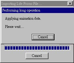 2. 選取任何一個副檔名為 *.lfa 檔案,以本例而言請選擇一個 Sundancer_happy.lfa (若您您有安裝 Life Forms for trueSpace 試用版的話,您可以在本試用版安裝的 目錄下的 \Animations\ 目錄中)。 3. 接著會開啟 Importing Life Forms File… 與 Performing Long operation 面板,如圖4;其會先將 Life Forms 的模型先匯入到 trueSpace4 之中,然後 再將動作套用到模型上。