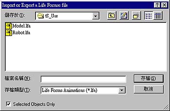 4. 然後按照上述的方式進行連結。連結後的人物模型 X, Y, Z 的位置最好是在 0,0,0 的位置,如範例檔案 Scene4.scn。 範例檔案:Scene4.zip Size=14K trueSpace4 場景檔 5. 從 Life Forms Import/Export 外掛程式中按下 Export,會開啟一個檔案對話框 ,如圖18。其中核取 Selected Objects Only 表示您所選取的模型將會被匯出,若 是取消此選項則會將場景中所有的模型都會出。