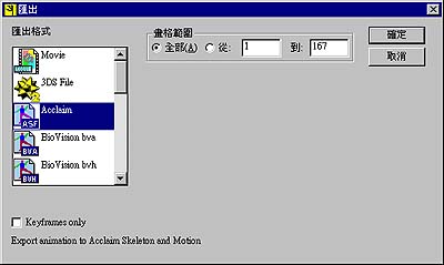 1 在Life Forms內,選取將要匯出動畫所在的視窗。 觀念提示:只限關鍵畫面的選項讓您只匯出關鍵畫面到 Acclaim 檔。如果您使用 Life Forms 內的簡化指令,降低動作資料內的關鍵畫面格數,就需要本選項。我們 建議您簡化動作資料,再匯出關鍵畫面,如此所產生的動作資料,將較易於被 Maya 處理。 在完成後會產生二個檔案,.ASF 及 .AMC 檔將被匯出,ASF 檔會包含人物的骨骼資料, 而 AMC 則包含人物的動作資料。 第二部份︰轉換Acclaim檔 Maya 無法直接讀取 Acclaim 動作資料檔,必須先轉為 Maya melscript,才能被讀取。