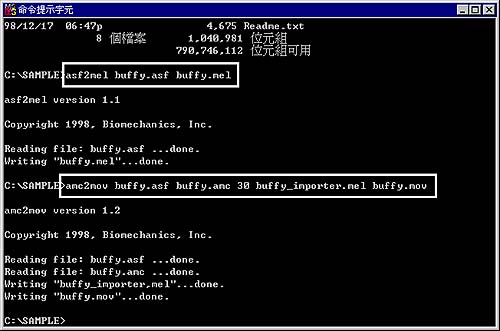 asf2mel.exe。 使用說明:asf2mel 需要兩個參數︰ASF 檔 (File.asf) 及輸出檔名 (File.mel)。 本指令會將 File.asf 內的骨骼資料轉為 melscript 檔 File.mel。 譬如若要轉換Buffy.asf,請輸入︰ 5 接著,在 Windows NT 的 DOS 模式下,輸入以下的指令︰ amc2mov 需要五個參數︰ASF 檔、AMC 檔、畫面速率、以及所要產生的