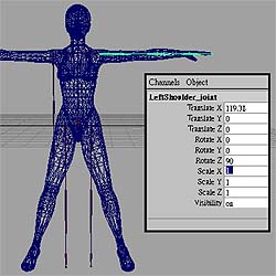 您會從檢視區看到人物,其手腳並未對齊網面,不過別擔心,以下的步驟可以修正該問題。 重要事項:此時請不要移動骨骼的根連結,也不要縮放骨骼,否則將無法套用動作資料。 第二部份︰貼附皮膚 貼附皮膚是把網面跟骨骼連結的動作,如此骨骼的動作才能使結構變形。在貼 附皮膚到骨骼前,您需要旋轉骨骼以配合網面,也需要調整網面,以適當的配 合骨骼。本步驟內,您將學會如果旋轉骨骼的手及腳連結,還有如何讓網面跟 骨骼連結。 1 在 Maya 內,按下工具列的 Object Tool,如圖4。 2 按下代表左上臂的骨骼,以選取左肩連結。整個手臂會反白,LeftShoulder_joint 的旋轉欄位會顯示於面板視窗內,如圖5。