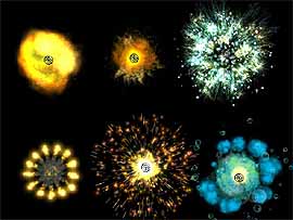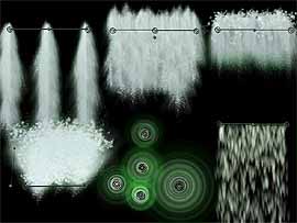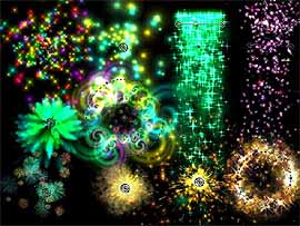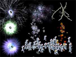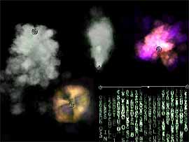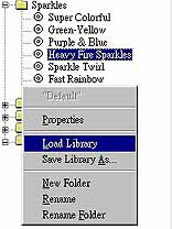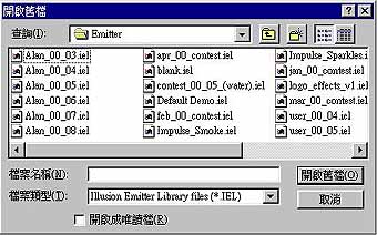 ILLUSION 它提供有 二十多組 Emitter 資料庫檔案 (*.iel),而一個 Emitter 資料庫又包含約 15~20 個不等的 Emitter。由於 ILLUSION 一次只能載入一個 Emitter 資料庫,所以若要使用其他的 Emitter 資料庫,您必須在資料庫視窗中按下右鍵,會出現一個快顯清單,只要點選「Load Library」選項 (圖1),即出現載入 Emitter 資料庫檔案對話框 (圖2),選擇您要使用的資料庫檔後,它會取代原來的 Emitter 資料庫的內容,您可以選擇火燄、瀑布、煙火、爆炸、蒸氣、閃電等讓人覺得「恐怖」的功能,如圖 3~8。